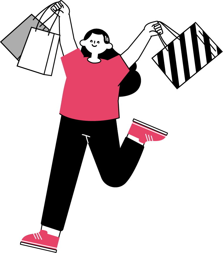 買い物を楽しむ女性のイラストです。お気に入りのアイテムを見つけた時の高揚感や、休日のリフレッシュ感を表現しています。ECサイトやファッションメディア、ライフスタイル記事の挿絵などにおすすめです。
