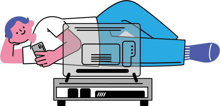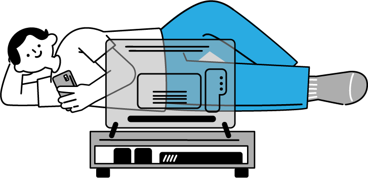 ソファや床に寝転びながらテレビを見ている男性のイラスト。リラックスした姿勢で映画や配信番組を楽しむ、おうち時間の一場面を描いています。落ち着いた雰囲気やオフの生活感を演出したいとき、CMやメディアの分析サマリーレポートなどにおすすめです。