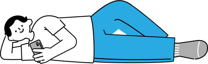 ベッドやソファで寝転びながらスマートフォンを操作する男性のイラスト。SNSを見たり、動画を流したりと、くつろぎながら過ごす日常のひとコマを描いています。リラックスした雰囲気を表現したい場面にぴったりです。