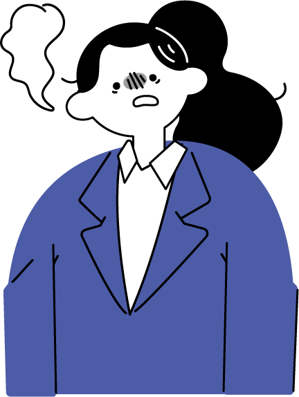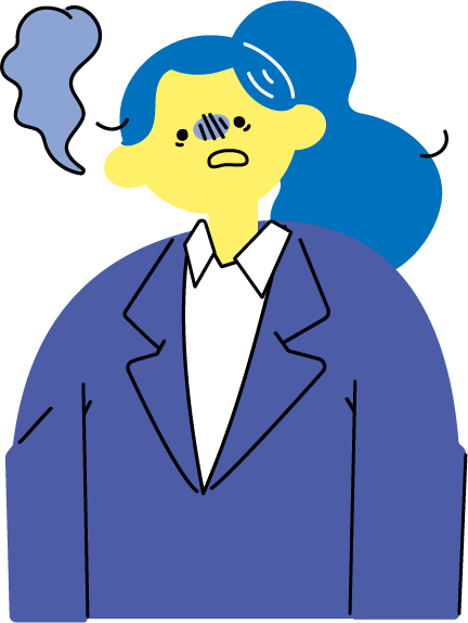 仕事の疲れでげんなりした表情の女性のイラスト。ため息混じりのけむりのように抜けていく魂が、社会人の日常的な疲れを表現しています。チームビルディング研修、働き方の見直し、メンタルケアの記事や資料などにもおすすめです。