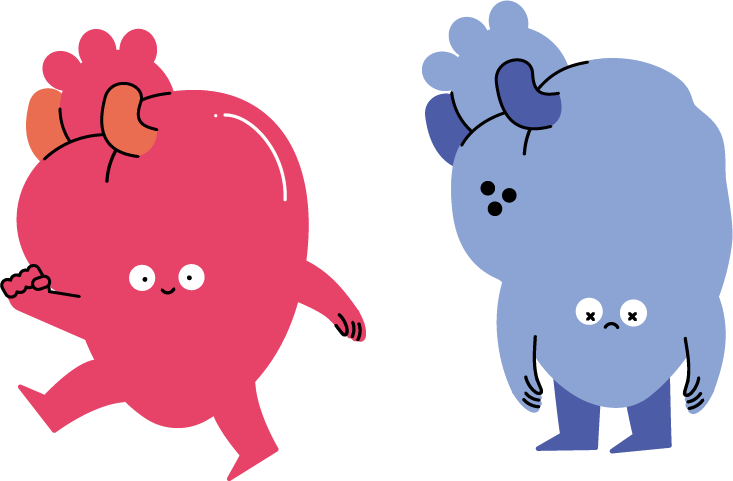 元気に動く健康な心臓と、疲れて不調そうな心臓を対比で描いた擬人化イラストです。 健康状態の違いや体調管理の重要性を、直感的かつ親しみやすく伝えられるため、医療・健康分野の説明資料や注意喚起コンテンツにおすすめです。 硬くなりがちなテーマでも、ポップな表現で理解を促したい場面に使いやすいイラストです。