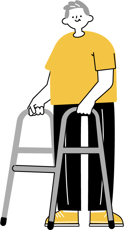 歩行器を使用して立っている高齢者の男性を描いたイラストです。 自立した生活を支える福祉用具の利用シーンとして、介護サービスの案内、リハビリテーションの説明、地域福祉や高齢者支援に関する資料など、日常生活に寄り添った文脈で使ってもらいやすい内容となっております。