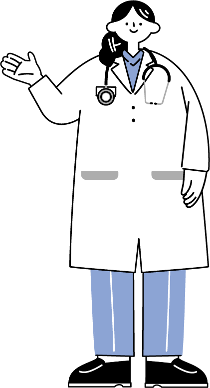 白衣を着た女性医師が、手を挙げて説明している様子を描いたイラストです。病院やクリニックにおける受付での案内や、来院時の流れ・施設利用に関する説明など、来院者に向けて情報を伝える場面を想定しています。