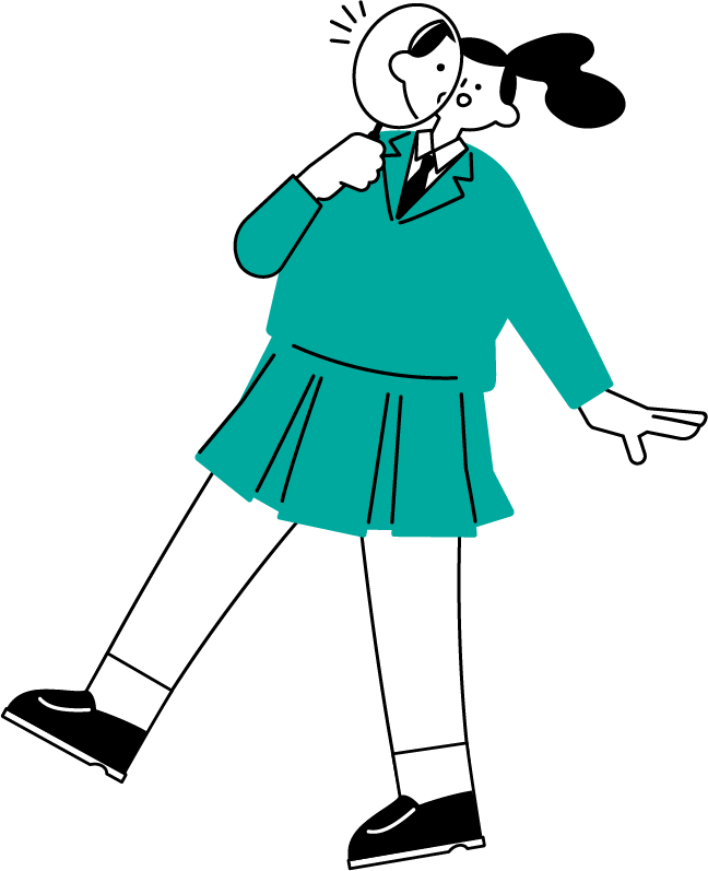虫眼鏡を使って何かをじっくり観察・確認している、制服姿の女学生のイラストです。 調査・チェック・検証・考察といったシーンを直感的に伝えられるため、学校関連の資料や教育コンテンツはもちろん、ビジネスやマーケティング分野での「確認」「分析」「見直し」を表現したい場面にもおすすめです。