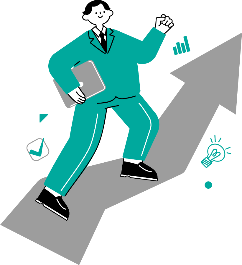目標に向かって前進し、成長していくスーツ姿の男性のイラストです。上昇する矢印やチェックマーク、電球のアイコンがあり、成功やキャリアアップ、スキル向上などのイメージとして使用できます。ビジネス関連の資料やWebコンテンツ、自己成長や目標達成をテーマにした記事などにおすすめです。